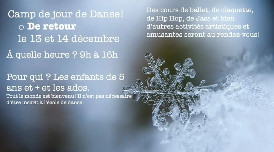 L’équipe de L’Atelier de la Danse aimerait vous offrir deux jours de camp le 13 et 14 décembre, de 9h à 16h. Service de garde offert le matin et le soir! ❄